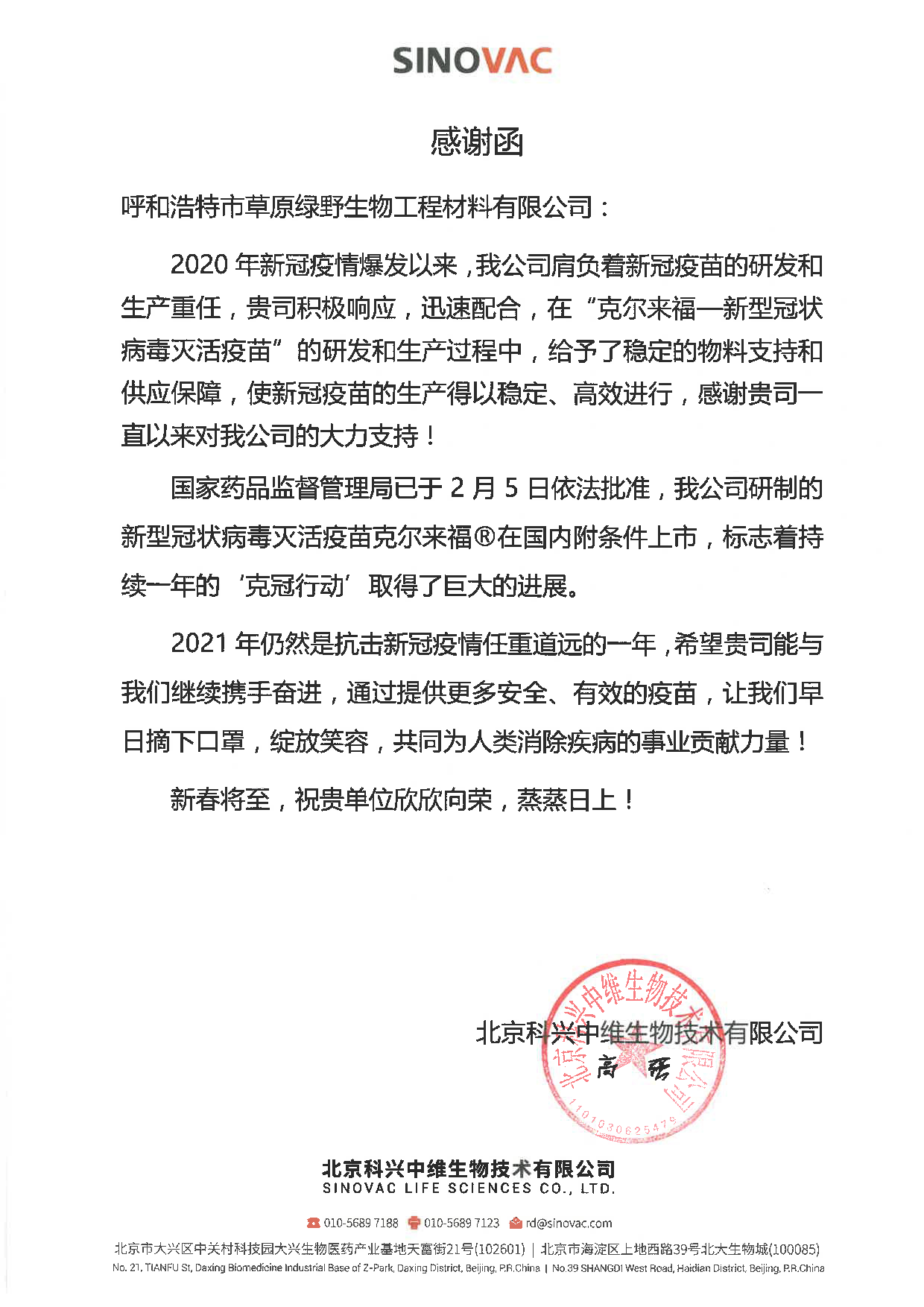 呼和浩特市草原綠野生物工程材料有限公司,坐落在中國乳都——呼和浩特,成立于1984 年5 月,是中國大型動物血清生產廠家之一。1995 年建造了國內首個生產血清的凈化車間,1996 年生產出了國內首批細菌內毒素小于10EU / ml 的新生牛血清,井收錄于《中國藥典》。于2001 年研發并生產出BVDV 、BDV 四陰性豬瘟專供新生牛血清。于2008 年6 月、2013 年09 月、2019 年12 月三次順利通過中國醫藥生物技術協會《牛血清生產達標企業》認證。